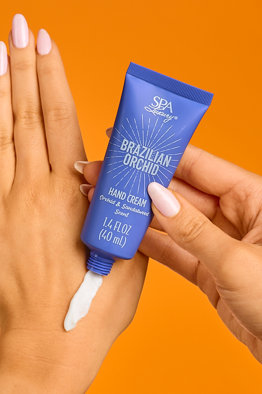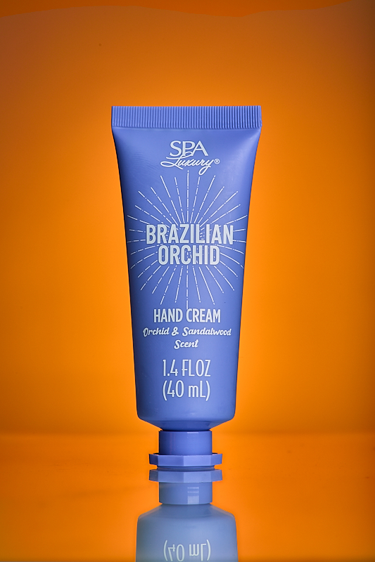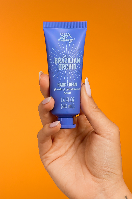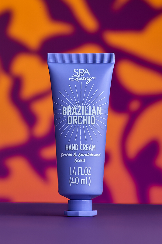 A commercial beauty shoot for Spa Luxury showcasing the Brazilian Orchid lotion through elevated product stills and lifestyle hand modeling. The series is designed to highlight both refined bottle stills with hand-in-use photography to convey modern spa luxury.